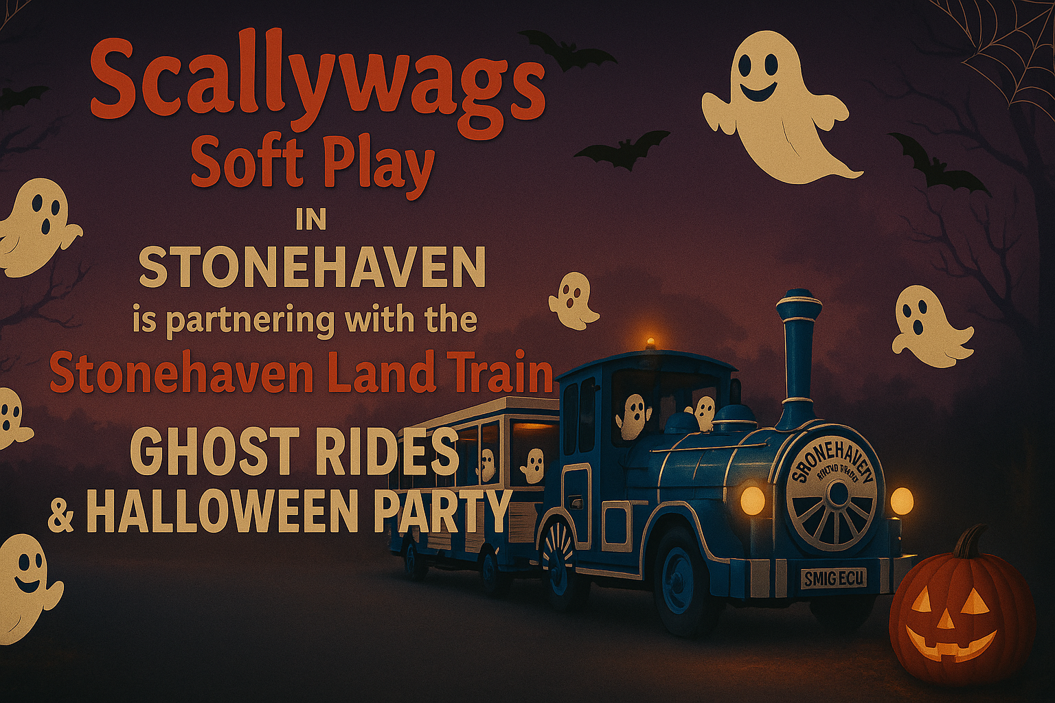 We’ve teamed up with the Stonehaven Land Train for Ghost Rides & a Halloween Party at Scallywags. Expect giggles, gentle scares, party games, and soft play. Costumes welcome, family-friendly vibes. Grab your tickets 👉 Select Dates: 4pm - 7pm 30th & 31st October, 1st & 2nd November. 30min train + 90min play session